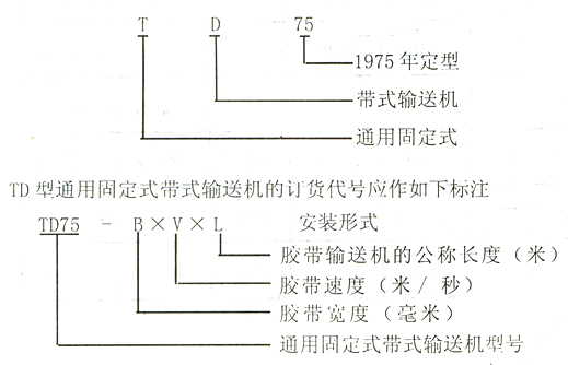 TD型通用固定式帶式輸送機(jī)的產(chǎn)品代號(hào)為T(mén)D75,其意義如下: